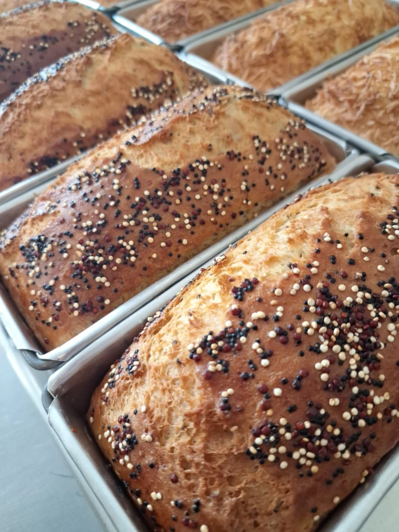 Ingredientes: farinha de arroz, farinha de grão de bico, fécula, polvilho, azeite, ovos, água, açúcar(para fermentação), sal, chia, linhaça e semente de girassol, fermento, goma xantana. Peso aproximado 500 gramas. Sem glúten, sem lactose.