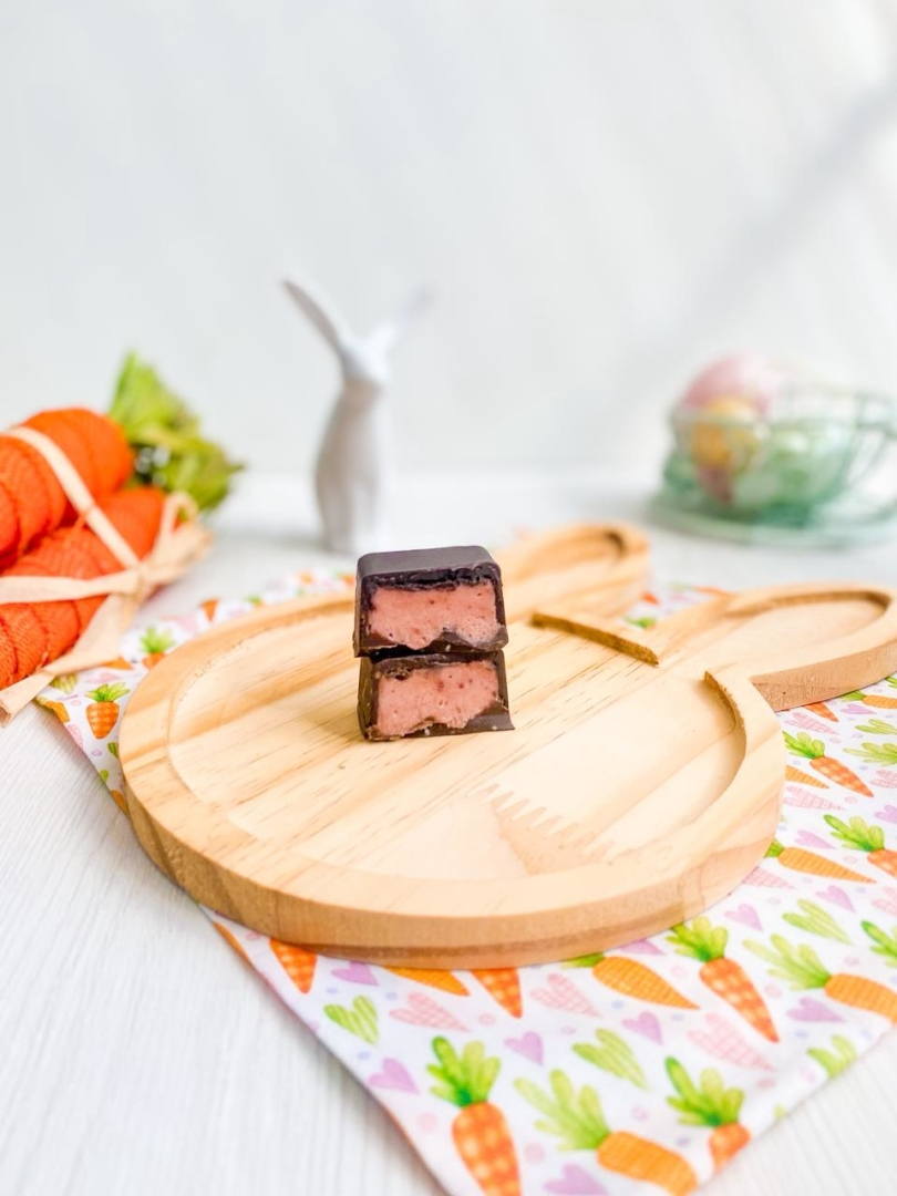 Feito com chocolate 70% zero açúcar com creme de avelã, zero açucar, sem leite e derivados, vegano