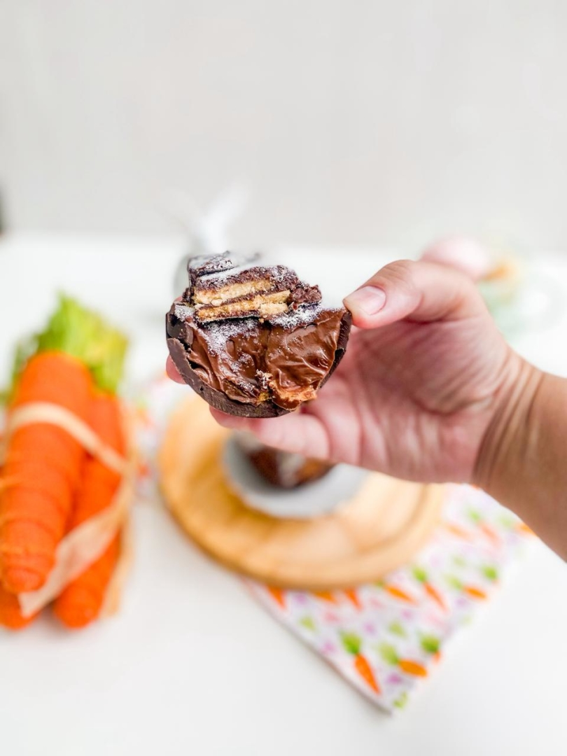 contém 1 casca de ovo 100 gramas, 1 bisnaga de creme de avelã, 1 tubete granulado de chocolate, 1 tubete com granulado coloridos naturalmente sem corantes artificiais, 1 pote com biscoitos no tema de pascoa 3 biscoitos, 1 quebra cabeça no tema de pascoa. lindo presente e interativo