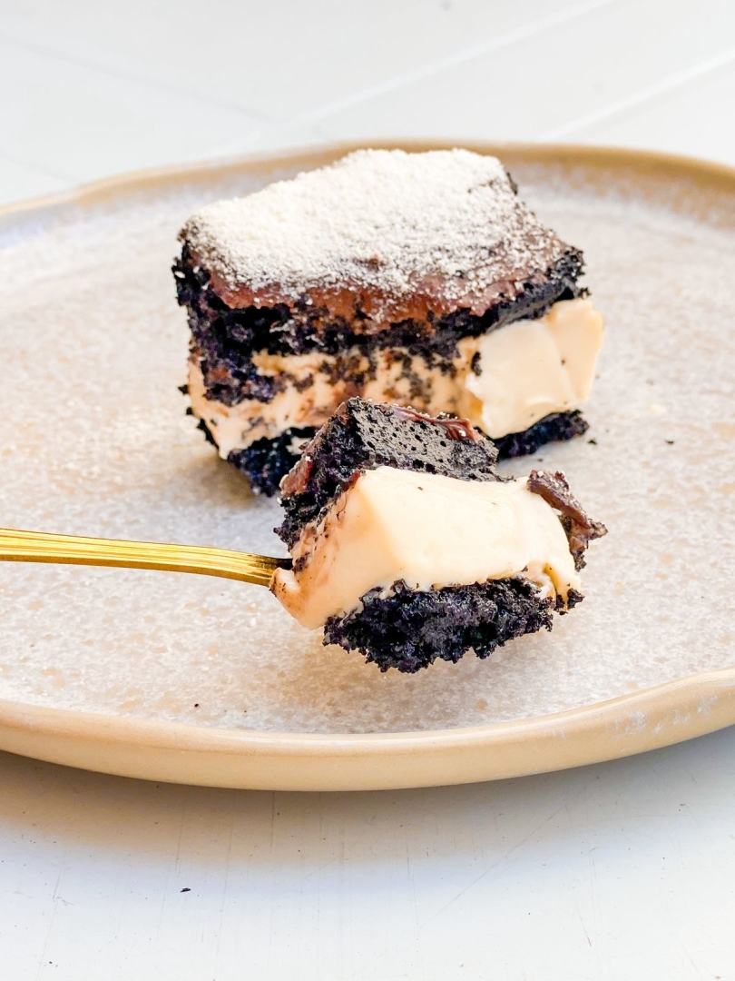 Sem glúten | zero lactose| adoçado stevia e taumatina| serve 1 pessoa Fatia com camadas de bolo de chocolate com recheio de creme de coco cremoso. Ing: ovos, farinha de amêndoas, farinhas sem glúten, stevia, taumatina , manteiga ghee, creme de leite zero lactose, chocolate 55% zero